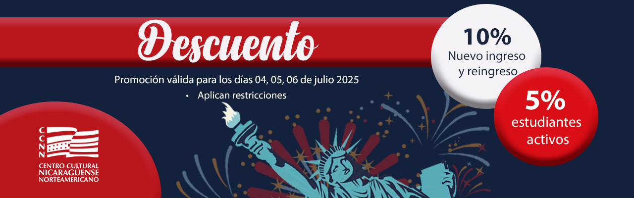 PREMIO: Se aplicará descuento del 10% en el pago del nivel a cursar en la sesión R05 modalidad diaria del 2025 y sesión S03 de modalidad sabatina y dominical del 2025, a los estudiantes de nuevo ingreso y reingreso bajo las condiciones detalladas en la sección CONDICIONES GENERALES. Se aplicará descuento del 5% en el pago del nivel a cursar en la sesión R05 modalidad diaria del 2025 y sesión S03 de modalidad sabatina y dominical del 2025, a los estudiantes activos en los cursos de inglés vigentes bajo las condiciones detalladas en la sección CONDICIONES GENERALES.